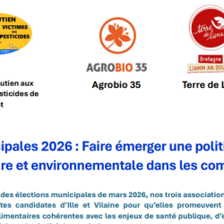 Dans le cadre des élections municipales de mars 2026, nos trois associations s’adressent à toutes les listes candidates d’Ille et Vilaine pour qu’elles promeuvent des politiques agricoles et alimentaires cohérentes avec les enjeux de santé publique, d’environnement, de justice sociale et de vitalité des territoires. […] lire l’intégralité du document
