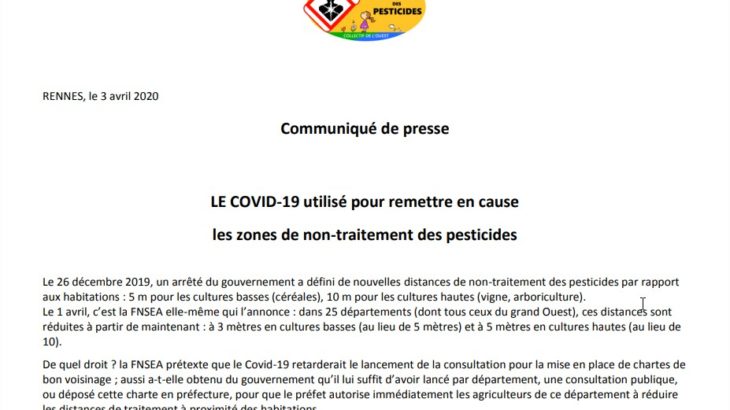 Vu la conjoncture actuelle, nous avons décidé de reporter l’AG du Collectif de soutien aux victimes des pesticides de l’Ouest prévue le 28 mars à NEULLIAC (56), à une date ultérieure. En effet, beaucoup de participants inscrits sont eux-mêmes déjà malades et il n’est pas question de prendre le moindre risque pour leur santé. Nous […]