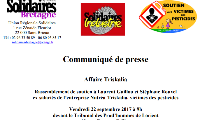 Communiqué de presse Affaire Triskalia Rassemblement de soutien à Laurent Guillou et Stéphane Rouxel ex-salariés de l’entreprise Nutréa-Triskalia, victimes des pesticides Vendredi 22 septembre 2017 à 9h devant le Tribunal des Prud’hommes de Lorient 10 rue Georges Collier voir le communiqué complet ici Laurent Guillou et Stéphane Rouxel, ex-salariés de la coopérative agroalimentaire Nutréa-Triskalia, […]