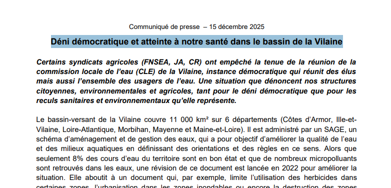 Certains syndicats agricoles (FNSEA, JA, CR) ont empêché la tenue de la réunion de la commission locale de l’eau (CLE) de la Vilaine, instance démocratique qui réunit des élus mais aussi l’ensemble des usagers de l’eau. Une situation que dénoncent nos structures citoyennes, environnementales et agricoles, tant pour le déni démocratique que pour les reculs sanitaires et environnementaux qu’elle représente.