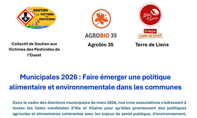 Dans le cadre des élections municipales de mars 2026, nos trois associations s’adressent à toutes les listes candidates d’Ille et Vilaine pour qu’elles promeuvent des politiques agricoles et alimentaires cohérentes avec les enjeux de santé publique, d’environnement, de justice sociale et de vitalité des territoires.